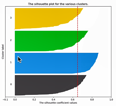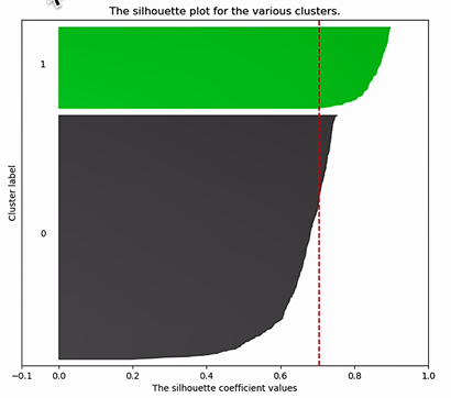每次聚类后,每个样本都会得到一个轮廓系数,当它为1时,说明这个点与周围簇距离较远,结果非常好;当它为0,说明这个点可能处在两个簇的边界上,当值为负时,暗含该点可能被误分了。