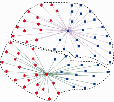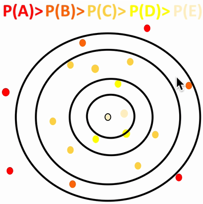 划分T1半径内的为同一类,T1和T2间的圆环内的为待定黑点,说明可能是同一类,也可能不是同一类。而对于T2外的点则判断肯定不是同类点。