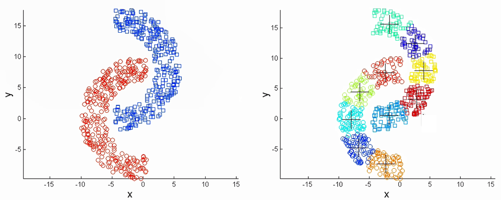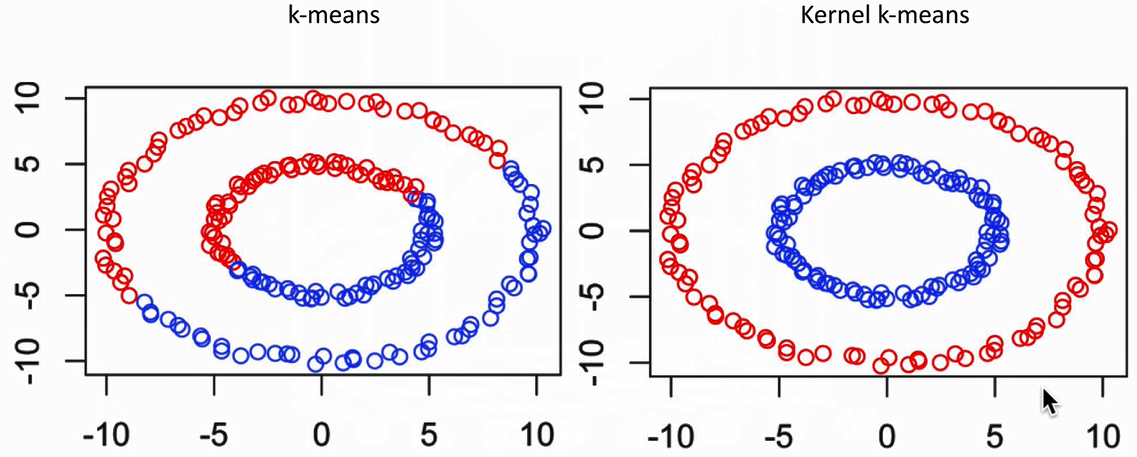 解决:线性不可分的问题。主要利用了核方法的技巧,把低维数据映射到高维空间再利用Kmeans做一次聚类。