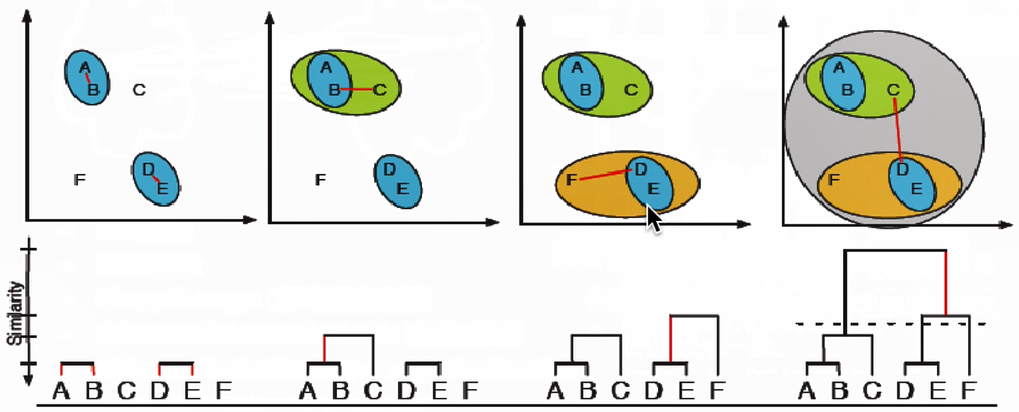 - 重复2,3两步,知道簇的数目等于用户给定的数目