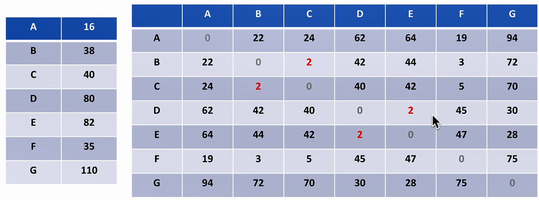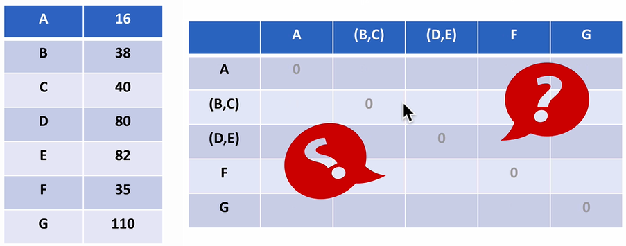 找到上面表格中聚类最近的两类,合并,再重复1的步骤