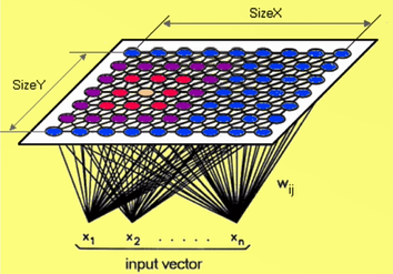 (1)SOM节点位于数据空间的任意位置,最接近训练数据的节点(黄色高亮部分)会被选中。它和网格中的邻近节点一样,朝训练数据移动。