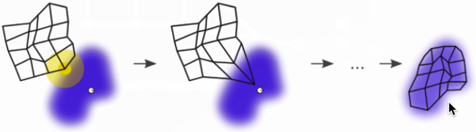 (2)在多次迭代之后,网格倾向于近似该种数据分布(下图最右)。