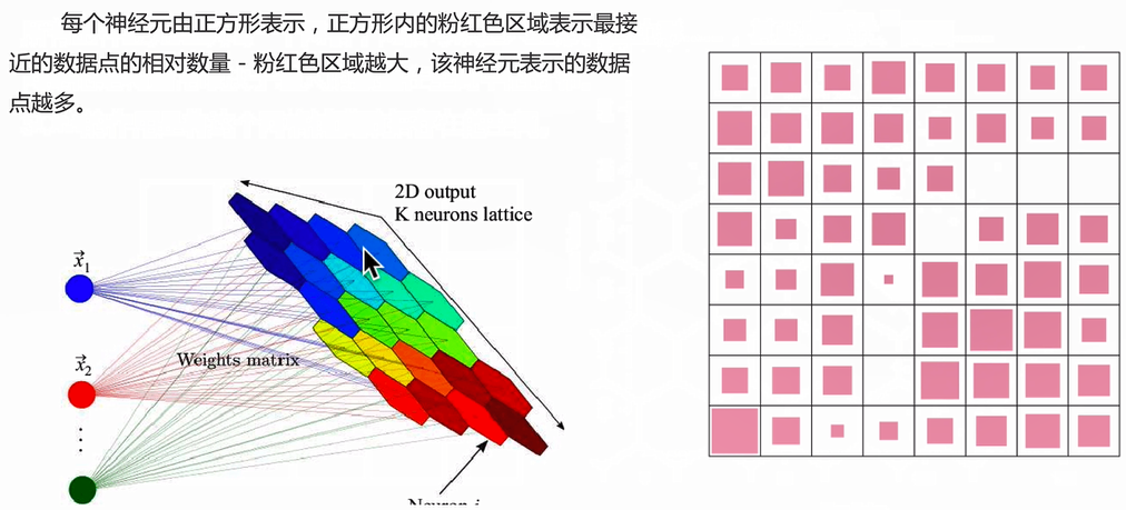 SOM为了保留输入向量的拓扑结构,构造了一个竞争层,一般为二维网格平面(也称Kohonen Network,因为SOM的提出者是芬兰神经网络专家Kohonen教授),网格点即为神经元,点与点之间保持一定的结构关系(即拓扑)。这里的竞争层就是原先的输出层,只不过这里用SOM做聚类任务,无需输出。(传统神经网络输出值的主要目的是为了做回归任务)。总结SOM就是一个单输出,单输出无隐藏层的神经网络结构。