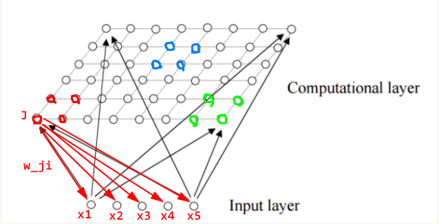竞争:对于每一个输入数据,找到与它最相配的节点。假设输入时D维的, 即 X={x_i, i=1,…,D},那么判别函数可以为欧几里得距离: