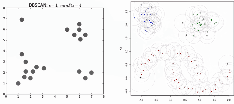 | 1. 聚类速度快,且能有效处理噪声,可以对任意形状的聚类 | 1. 数据量增大的时候,需要较大内存才能完成操作 |