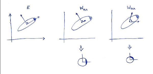 注:这里的 PCA 白化和 ZCA 白化看上去一样其实是不一样的,PCA 的数据在维度方向是无关的,相当于原数据发生了一个旋转,ZCA 则与原数据没有发生旋转,从第一个图可以发现这种旋转方式。下图可以反映这种变换。