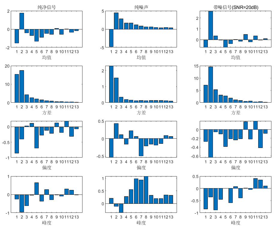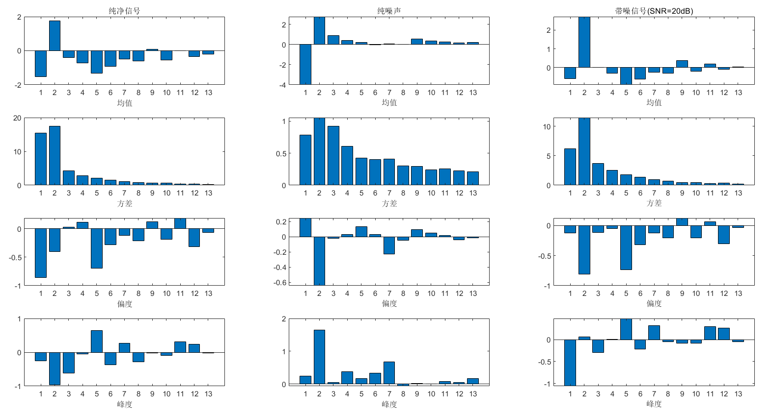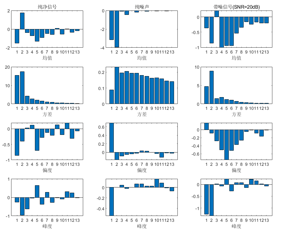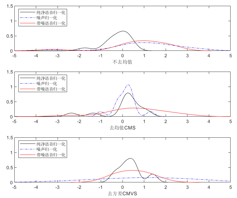 subplot 312; plot(xi_1,pdf_by_SNR_1,'k');hold on; plot(xi_2,pdf_by_SNR_2,'b-.'); plot(xi_3,pdf_by_SNR_3,'r'); legend('纯净语音归一化','噪声归一化','带噪语音归一化','location','northwest') legend('纯净语音归一化','噪声归一化','带噪语音归一化','location','northwest') xlabel('去均值CMS'); xlim([-5,5]);ylim([0,1.5]);