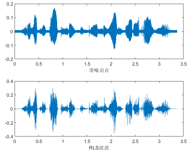 RLS:计算量巨大,理论上能快速收敛,通过实际观察波形图,确实前面一段语音噪声没了,但是相对于LMS算法对原波形的影响较大。应该是超参数没有设置到位导致的过渡的去噪。